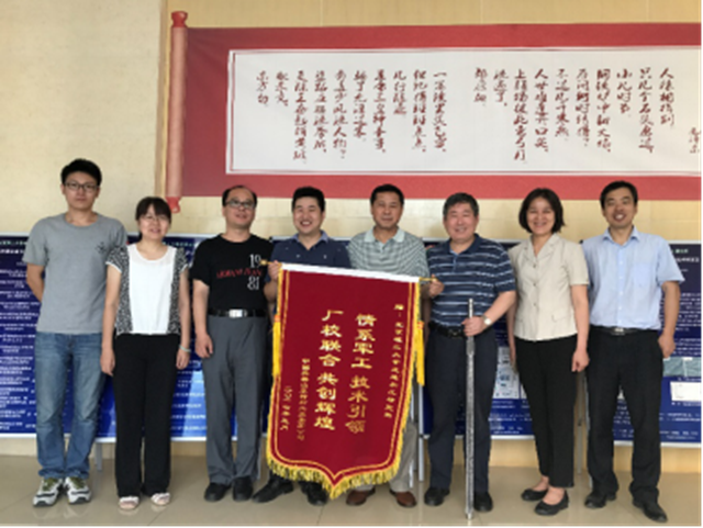 2017年6月14日上午,中国兵器工业集团公司直属企业山东特种工业集团有限公司安林东副总经理和赵建强部长来北理工先进加工研究所进行校企合作交流,并向先进加工研究所赠送了“情系军工,技术引领,厂校联合,共创辉煌”的锦旗,感谢研究所研发的成套拉刀铣刀和相关工艺,解决了超高强度弹钢内外槽加工难题和拉刀断齿问题,加工效率提高一倍以上,刀具寿命提高十倍,关键时刻保障了生产任务的完成。