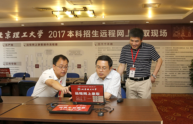 胡海岩首先查看了录取现场的2017年本科录取信息统计表,听取了李振键关于近期录取工作进展情况的汇报,了解到部分省份的普通一批次已经开始投档,国家专项计划等提前批次录取已至半程。在国家专项计划批次已经结束录取的10个省份,BB贝博生源质量继续提升,7个省份录取最低分高于当地一本线100分以上,3个省份高于150分以上;各省份国家专项计划录取最低分与一本线的分差普遍较去年提升10分以上,部分省份提升幅度接近30分。