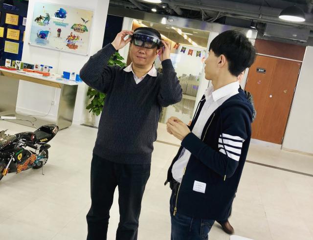 薛正辉介绍了学院近年来产学研发展情况及校友工作情况,同时十分欢迎史晓刚与学院进行深度合作与交流。徐建表示希望史晓刚可以参与进学院学生人才培养的工作中来,何遵文就科研合作提出了意见与建议。史晓刚本人也表示十分感谢学院领导的关心和支持,日后会竭尽全力,参与到学院产学研合作与学生人才培养的工作中去,希望通过大家共同努力进一步加强校友与学院之间的交流与合作。史晓刚带领大家体验相关AR产品,并进行相应讲解。