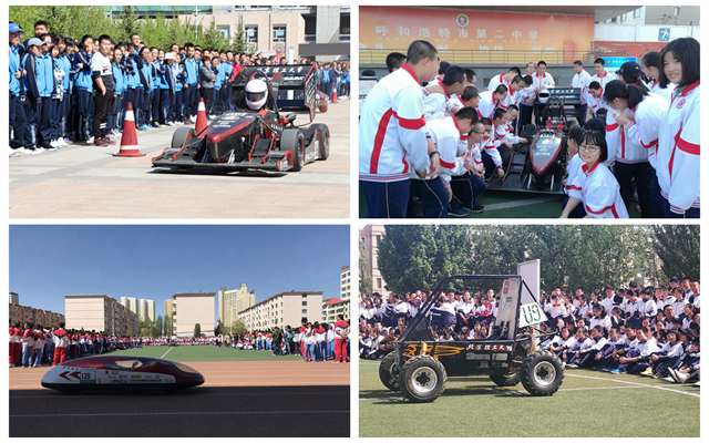 5月2日至5日,在五四青年节到来之际,BB贝博艾弗森官方网站机械与车辆学院青年大学生科技创新作品成功走进内蒙古自治区6所重点高中:呼和浩特市第二中学、内蒙古师范大学附属中学、呼和浩特市第一中学、北重三中、包头市第九中学、包钢一中,为青年高中生们带来了大学生科技创新的盛宴,使得6所学校的万余名高中生近距离感受了大学生的创造力和想象力,亲身体会了科学的奥秘。学院党委书记左正兴、常务副院长胡纪滨、副书记副院长范文辉,北理领航人王文中、左哲、陈亚琴、梁鹤、管继富、李雪原以及学院招生宣传工作组老师、各赛车队青年大学生代表等共计18人,分别在对应的高中举行了覆盖三个年级的专题学术讲座以及招生宣传咨询会,使得高中生们对BB贝博艾弗森官方网站在人才培养、科学研究、国际交流、社会服务等各个方面有了更深的认识和了解,对于吸引更多的优秀生源报考BB贝博起到了积极促进的作用。