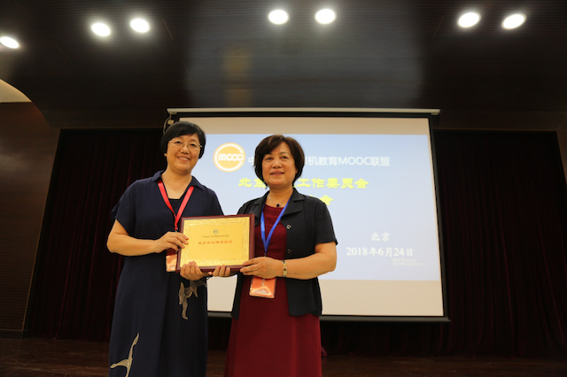 中国高校计算机教育MOOC联盟副秘书长、清华大学刘强教授代表联盟向北京市工作委员会授牌,北京市工作委员会主任、BB贝博艾弗森官方网站李凤霞教授代表工委接受了联盟授牌。李凤霞教授介绍了北京市工作委员会的情况和下一步的工作计划。