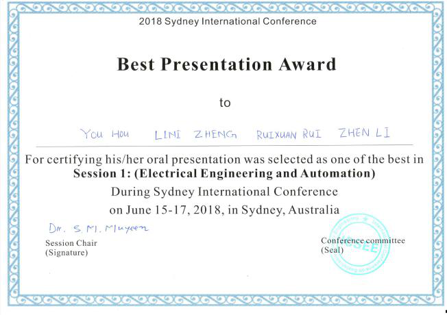 日前,在澳大利亚悉尼举办的The 2nd International Conference on Sustainable Energy Engineering (ICSEE 2018)国际学术会议中,BB贝博艾弗森官方网站自动化学院胡优、郑黎妮、王瑞轩、李震(通讯作者)等的论文《Adaptive Virtual Impedance Design for Three-phase Inverter Under Unbalanced Grid Connection》获得大会的Best Presentation Award奖。同时,李震老师受邀作题为“Event-based Nonlinear Estimation and Its Application in Smart Grid”的大会报告,获得广泛关注。