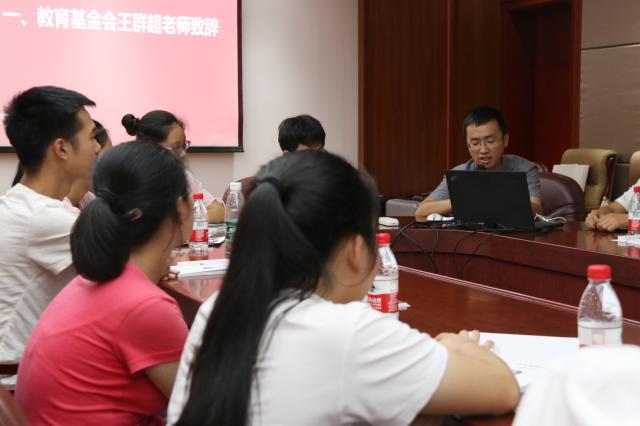 教育基金会办公室王群超老师致辞,他欢迎大家加入北理工的温暖大家庭,并介绍了北理工教育基金会作为在民政部注册的4A级慈善组织,在学校建设、教学科研、学生资助等方面发挥的重要作用,并回顾了“梦想启航”助学金的设立背景和内涵,简要介绍了教育基金会设立的奖助学金情况;基金会志愿者蒋子杰同学介绍了学校情况,他从北理工的历史讲起,向新生阐述了延安精神、文化传承和科技成就等,让师弟师妹在入学前得以充分了解学校;教育基金会办公室高静琦老师全面介绍了学校资助工作体系,重点讲述了奖助学金设立情况以及入学后直接相关的资助政策,鼓励新生们继续保持刻苦努力的状态,不要为经济困难而担忧,以优异的成绩来回报父母和社会。