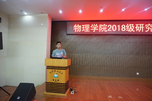 2018级研究生尹思瀚代表新生发言。尹思瀚同学表达了考入物理学院的激动心情,讲到自己作为一名新北理人对“德以明理、学以精工”校训的理解。对即将开始的研究生阶段学习,表示将尽快从思想上完成从本科生到研究生身份的转换,树立高远的人生志向,注重自主性、创新性的学习,牢记“团结、勤奋、求实、创新”的校风,在学术领域积极探索,刻苦钻研,追求卓越。
