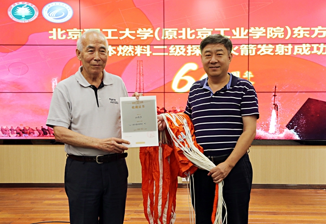 宇航学院退休教师姚德源代表夫人刘素文向校史馆捐赠了东方系列固体燃料二级探空火箭回收系统使用的降落伞。刘素文老师于2017年去世,生前曾从事“505”项目火箭回收系统开伞机构研究工作,有幸保存了珍贵的降落伞实物,并嘱托捐赠给学校。校史馆馆长王民代表学校接受捐赠,并颁发收藏证书。