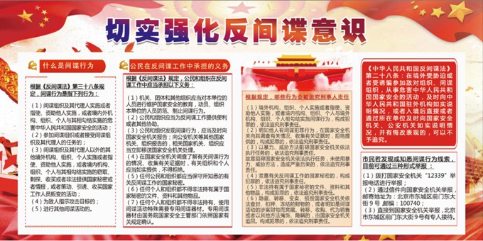 为进一步增强全校师生的国家安全意识、法律意识和反间防谍意识,提高全校师生履行法律责任义务的自觉性,BB贝博艾弗森官方网站保卫部于2018年11月1日组织开展“反间谍法宣传日活动”。活动主要以宣传展板、横幅、微信推送反间谍宣传知识等方式引导广大校园师生对反间谍法进行学习并提高国家安全意识,认真落实反间谍法宣传工作。