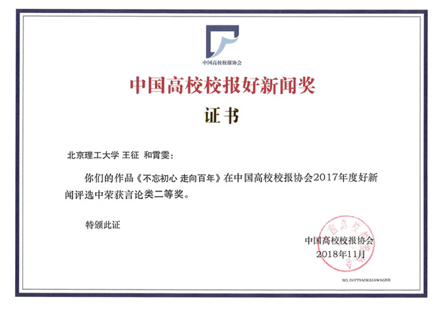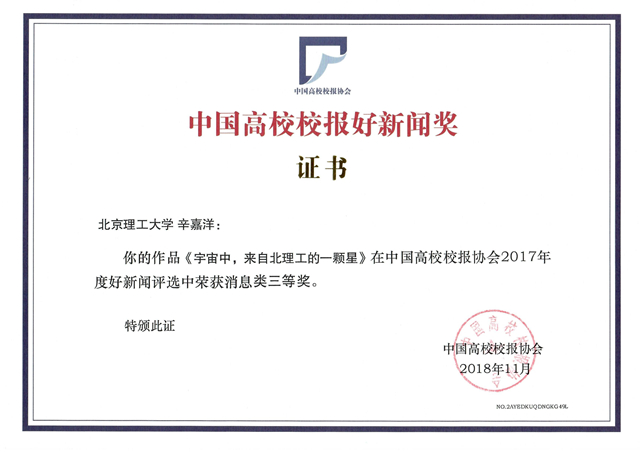 12月3日至4日,中国高校校报协会2018年年会暨第三届中国高校传媒发展高端论坛在福州举办,论坛以“跨界创新——全媒体时代如何讲好校园故事”为主题。论坛上揭晓了2017年度“中国高校校报好新闻”评选结果,BB贝博校报荣获佳绩。其中,《微信“地球变脸”,北理工技术助力中国气象卫星明辨“风起云涌”!》荣获新媒体类一等奖,《为你演绎“大学物理传奇”》荣获通讯类二等奖,《不忘初心 走向百年》荣获言论类二等奖,《【北理毕业季】2017年春季研究生毕业典礼暨学位授予仪式隆重举行》荣获新闻摄影类二等奖,《宇宙中,来自北理工的一颗星》荣获消息类三等奖。