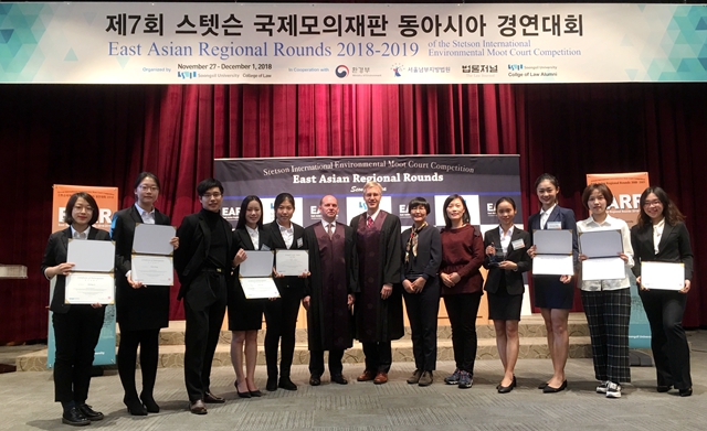 国际环境法模拟法庭大赛创始于1996年,由美国史丹森大学法学院(Stetson University College of Law)主办,是国际环境法领域极具广泛国际影响力的模拟法庭比赛。该比赛全程使用英文,分为地区选拔赛和国际决赛两个阶段。地区选拔赛分为北美太平洋赛区、北美大西洋赛区、拉丁美洲赛区、东亚赛区等8个赛区。东亚赛区选拔赛由韩国崇实大学承办。