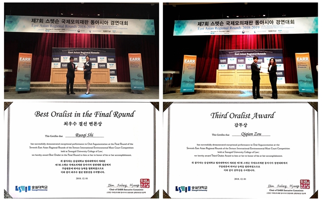 2018年11月28日至12月1日,第23届“史丹森”国际环境法模拟法庭大赛(Stetson’s International Environmental Moot Court Competition,IEMCC)东亚赛区选拔赛(East Asia Regional Rounds,EARR)在韩国崇实大学(Soongsil University)举行。BB贝博艾弗森官方网站法学院代表队一路过关斩将,力克群雄,最终勇夺冠军,并获得了赴美国参加全球总决赛的资格。本次大赛中,石若琪同学获得了总决赛最佳辩手(Best Oralist in the Final Round),邹祺芊同学获得最佳辩手第三名(Third Oralist)。