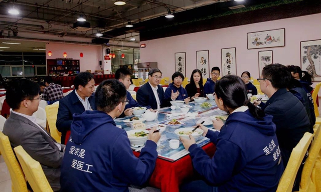 晚饭时间,张军邀请求是书院医工融合实验班的同学们在南区食堂共进晚餐。2018年,学校围绕医工融合、生物医学工程领域的国际发展前沿和国家重大需求,为培养具有学科领军、领导能力的医工融合一流创新拔尖人才,首次开设医工融合实验班。餐叙中,张军不仅分享了自己对大学生活的理解,更为大家展望了医工融合的广阔发展前景,鼓励同学们努力学习,成为医工融合专业的优秀学生。“与校长共进晚餐,感觉就是围坐在一桌的温馨‘家人’。在听了张校长介绍的医工融合发展前景后,我对专业更加充满期待,也更加坚定自己所选择的发展之路。”医工融合实验班的康安顺同学分享了自己的感受。