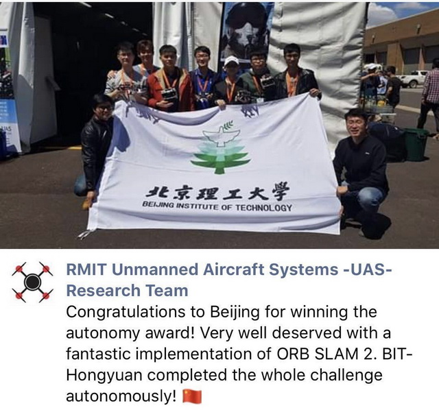 日前,2018年国际微小型无人机赛会(International Micro Air Vehicle, IMAV '2018)在在澳大利亚墨尔本举行,BB贝博艾弗森官方网站自动化学院BIT-Hongyuan代表队完成了室内和室外比赛,获得了赛会室内赛自主奖(Autonomy Prize)和室外赛总分第三名。本次比赛得到了北京元六鸿远电子科技股份有限公司大力支持。