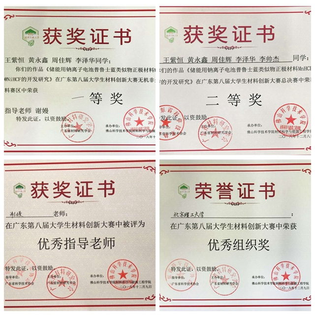 2018年12月8日至9日,由广东省材料研究学会主办的第八届广东大学生材料创新大赛在广东省佛山市佛山科技学院举行,BB贝博艾弗森官方网站材料学院海“钠”百川代表队参与比赛并取得无机非金属赛区分决赛一等奖,总决赛二等奖的优异成绩,谢嫚老师获得优秀指导老师奖,BB贝博艾弗森官方网站材料学院获优秀组织奖。项目成果还在路演环节被今日头条、东方财富网等主流媒体报道。
