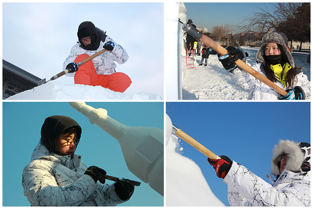 在哈尔滨零下20多度的严寒中,北理工雪雕队队员们意志坚定、不轻言放弃,克服了口罩手套结冰、户外作业时间长、工作强度大等诸多困难,让冰冷的雪块逐渐焕发出火热的生命力。