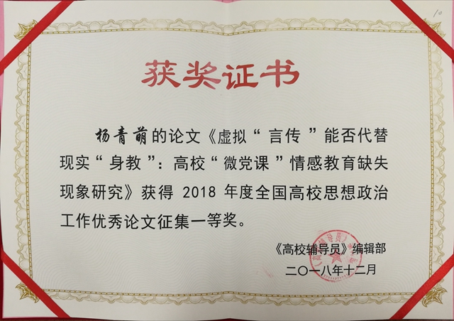 在2018年度全国高校思想政治工作优秀论文征集活动中,杨青萌撰写的论文《虚拟“言传”能否代替现实“身教”:高校“微党课”情感教育缺失现象研究》,荣获一等奖。全国高校思想政治工作优秀论文征集活动由教育部思想政治工作司指导,面向全国高校辅导员开展,经专家匿名评审,共评出优秀论文97篇,其中一等奖19篇,二等奖32篇,三等奖46篇,获奖论文第一作者受邀参加第十届全国高校辅导员工作创新论坛。论坛由中国高等教育学会辅导员工作研究分会主办,浙江大学承办,以“深入学习贯彻习近平新时代中国特色社会主义思想,德智体美劳五育并举,培养担当民族复兴大任的时代新人”为主题,高等教育领域专家及来自各省(区)的优秀辅导员代表等200余人,围绕论坛主题进行交流研讨。