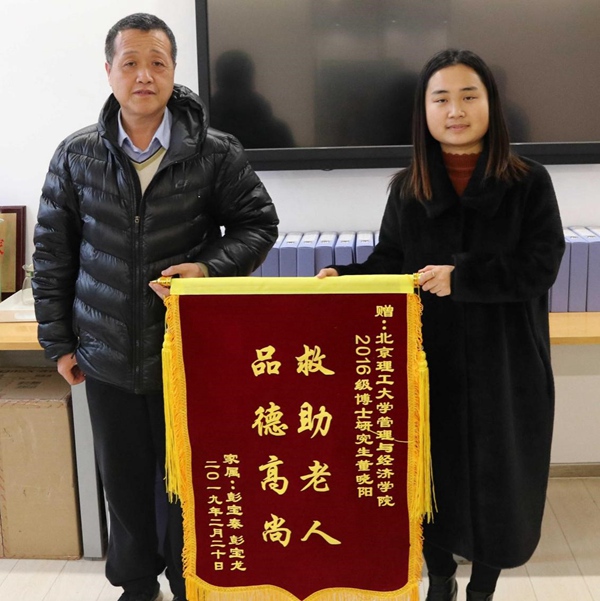 2月26日,北京市民彭先生专程带着锦旗来到BB贝博艾弗森官方网站,代表全家表达对管理与经济学院2016级博士生董晓阳同学和人文与社会科学学院2017级博士生单良艳同学的感激之情。