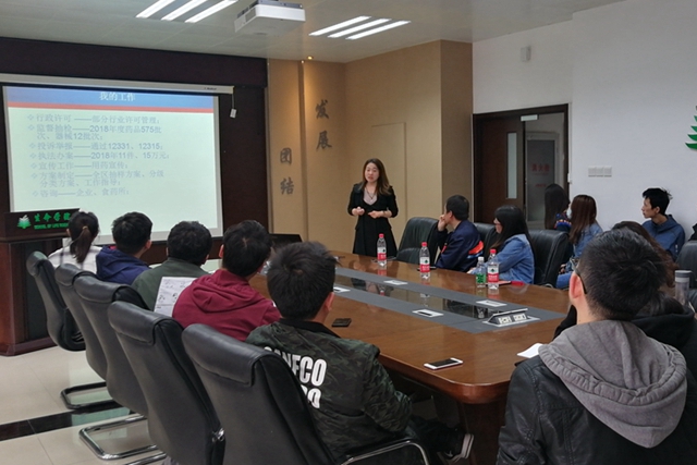 2007级本科生袁敬梅,2011年保送北大读研究生,2014年起就职北京市通州区市场监督管理局,负责药械经营监管工作。她从保障人民群众健康的角度介绍了三品一械的市场监督、管理、执法等相关行政事务、管理规范等内容,引导同学们深入基层,运用自己所学知识服务人民群众。