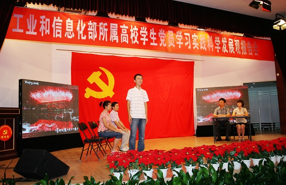 此次报告会汇集了工信部下属7所高校学生党员在学习实践科学发展观中总结的优秀经验,并以报告、短剧等形式予以展示。BB贝博共有50余名师生参加了报告会的演出,其中, 3名学生党员代表和设计学院书记杨海滨、管理学院辅导员彭明雪模拟展示了BB贝博德育答辩的精彩内容。