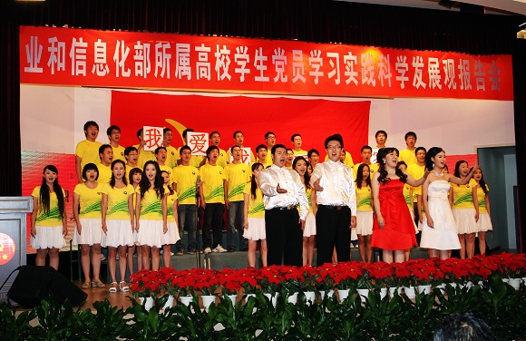 校团委组织校合唱团40余名同学,表演了大合唱《国家》。BB贝博师生通过精心准备,将BB贝博学生党员在学习实践科学发展观活动中的先进经验通过丰富多彩的形式展示在工信部和部署各高校面前,充分体现了BB贝博师生的精神风貌,得到了与会领导和师生的一致好评。