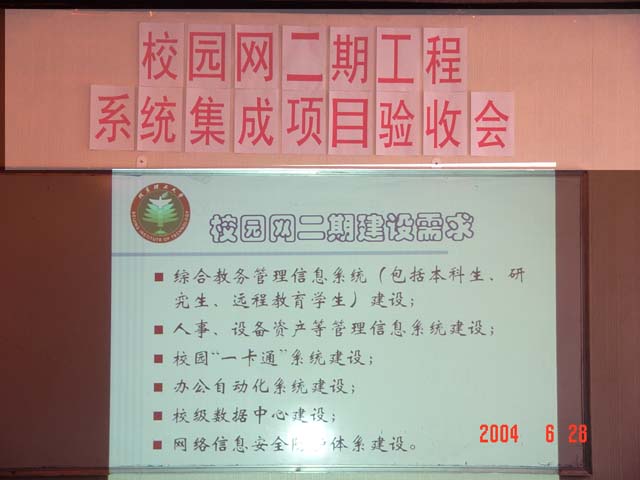 2004年6月28日上午,受BB贝博艾弗森官方网站校园网二期工程建设领导小组委托,BB贝博艾弗森官方网站实验室设备处在BB贝博艾弗森官方网站网络信息中心会议室主持召开了“BB贝博艾弗森官方网站校园网二期工程系统集成”、“BB贝博艾弗森官方网站信息楼网络系统集成”、“BB贝博艾弗森官方网站学生1号公寓网络系统集成”三个项目的工程技术验收会。