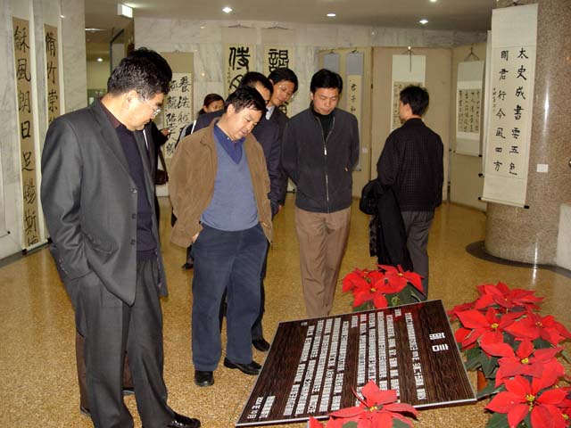 校党委书记焦文俊、副书记、副校长杨宾、副校长侯光明等校领导在观看书画展前言。