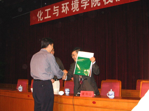 会上院分党委书记房建国老师代表学院向董海山院士敬送礼物。