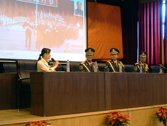来自天安门国旗护卫队的一名班长和他的战友们向莘莘学子们讲述了以国旗为内容、以升好祖国第一旗、练就一身过硬本领为荣耀的国旗卫士们刻苦训练、认真执勤、神圣护旗的动人事迹,也和大家谈了对国旗护卫工作的认识、训练的艰辛以及对这份特殊职业的热爱。战士们那份忠诚爱国、无私奉献、吃苦耐劳、无怨无悔之情和坚强刚毅的品格深深打动了在场的每一名同学,鼓舞人心的报告不时被大家雷鸣般的掌声所打断。60分钟的报告期间,三名战士一直保持着挺直的坐姿,也让同学们赞叹不止。