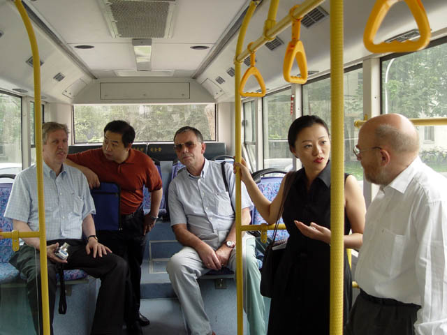 副校长杨树兴教授陪同代表团成员感受电动大客车的舒适、便捷与环保。