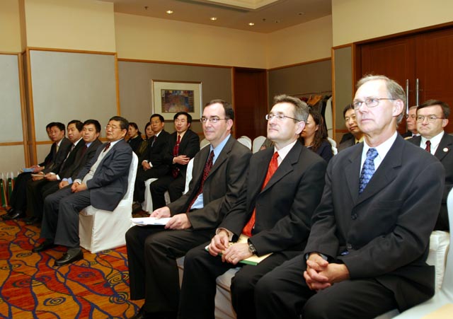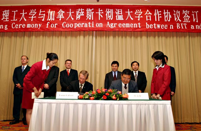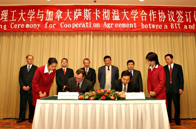 出席签字仪式的有BB贝博焦文俊书记、杨宾副书记、副校长、杨树兴副校长、萨斯卡彻温省省长Lorne Calvert 先生、萨斯卡彻温省工业资源部部长 Eric Cline 先生、萨斯卡彻温大学副校长 Steven E. Franklin 博士及加拿大驻华使馆公使等。出席签字仪式的还有BB贝博生命科学院张玉奎院士、研究生院副院长梅文博、人事处处长于倩、招生分配处处长郝志强、生命科学学院院长邓玉林、副院长罗爱琴等。加拿大萨斯卡彻温省省长Lorne Calvert 先生代表政府对两校合作协议的成功签署表示祝贺。他说,今天是一个十分重要的日子,因为有两所著名的大学即将在这里签订协议。我们的政府对这个协议以及由协议而产生的一切行动都将给予最大的支持。政府部门将努力为两所学校今后的合作提供良好的环境,积极推动合作的深入开展。焦文俊书记在讲话中表示,中加两国的友好源远流长。自1970年建交以来,双方的友谊与日俱增。今年是中加建交35周年,两所大学在这个时刻签订校际合作协议,意义重大。随后,杨树兴副校长和萨斯卡彻温大学副校长 Steven E. Franklin先生分别致词。