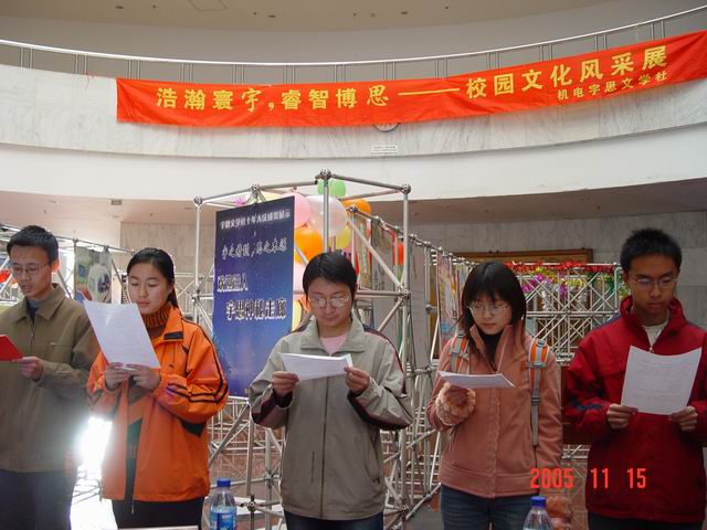 2005年11月20日晚7:00,由机电工程学院分团委主办,机电工程学院宇思文学社承办“宇思文学社十周年社庆晚会暨‘青春’有奖征文颁奖典礼”在中心教学楼一层报告厅拉开了帷幕。