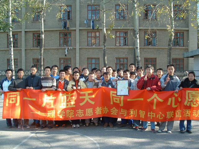 北京丰台利智中心是一家以帮助智障人士获得基本生活能力的非营利性机构,这里是理学院志愿者协会的活动基地,两年来,青协组织了多项活动,为那里的智障学员送温暖、献爱心。今年十月到十一月,协会又以“同一片蓝天,同一个心愿”为主题,开展了一系列的联谊活动。