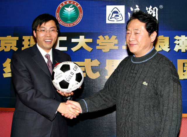BB贝博足球队总教练金志扬教授向浪潮集团赠送有BB贝博足球队员签名的足球,感谢浪潮集团对BB贝博体育事业的大力支持。