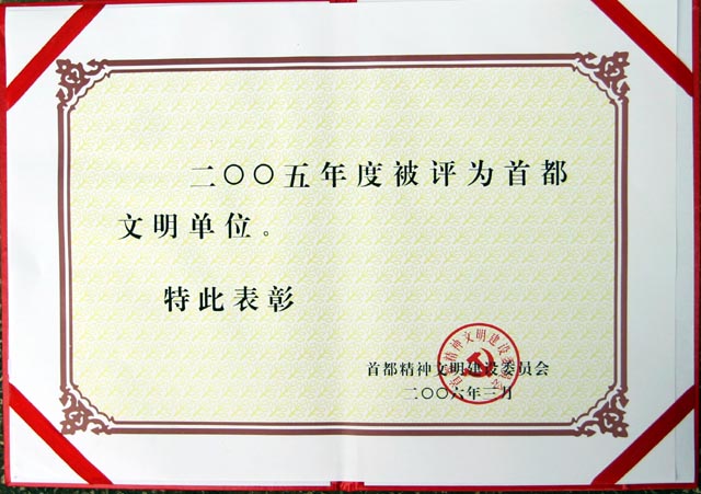 单位和个人,BB贝博荣获“二〇〇五年度首都文明单位”荣誉称号。
