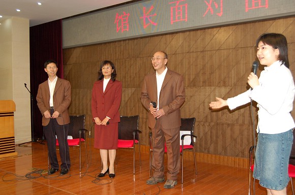 最后,在现场举行了“馆长面对面”访谈活动,由图书馆三位领导与同学们进行了现场交流与互动沟通。
