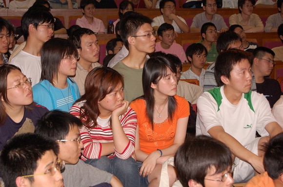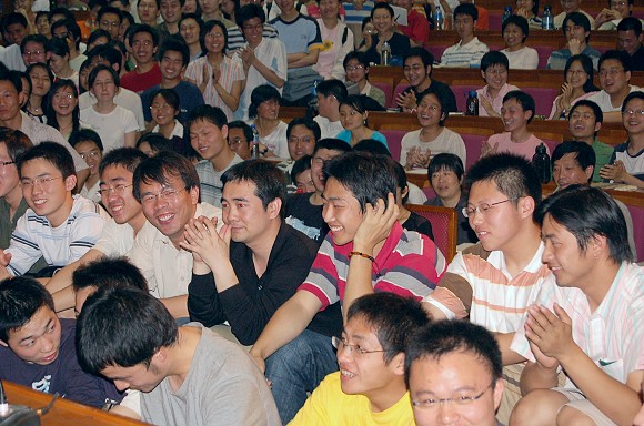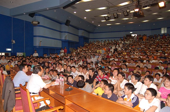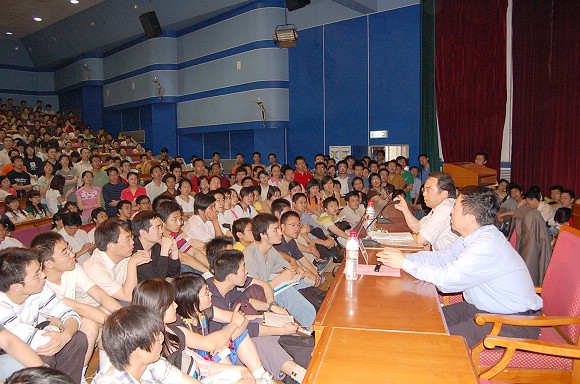在本次讲座的宣传阶段,学校的主要网络论坛共有约3500人次浏览讲座预报的帖子,讲座开始前的三个小时就有人早早的来到会场等候,能容纳500人的中教报告厅不但座无虚席,报告厅的过道、门口和讲台上都坐满了热情的听众,据不完全统计,整场讲座有教师、职工、研究生、博士生、本专科生、共计800余人先后来到讲座现场,有许多听众由于来的较晚甚至无法挤进会场。