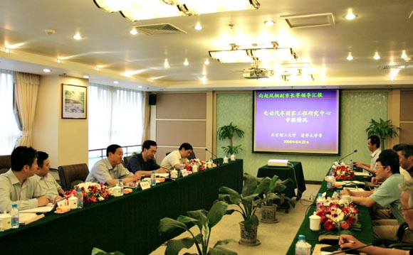2006年6月20日,北京市副市长赵凤桐等领导来BB贝博听取申报电动汽车国家工程研究中心情况汇报。BB贝博副书记、副校长杨宾、副校长孙逢春参加了会议。