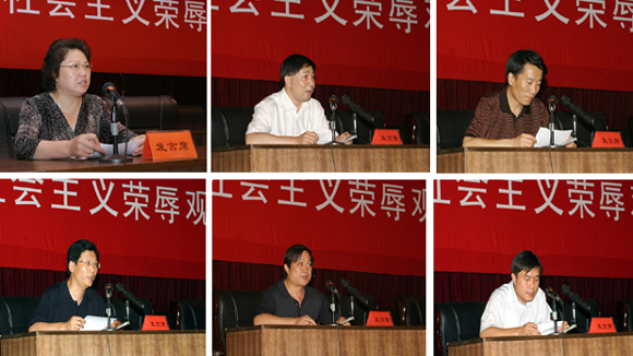 机电工程学院党委书记刘淑艳(上左),机械与车辆工程学院院长项昌乐(上中),材料学院院长王鲁(上右),学生工作处处长刘明奇(下左),出版社社长杨志坚(下中),党委组织部长龚裕(下右)在交流会上就如何贯彻社会主义荣辱观并结合本单位的具体工作畅谈了自己的学习体会。