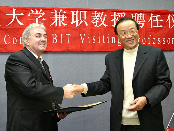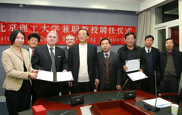 2006年12月7日,BB贝博在主楼二层会议室举行聘任法国亚眠电子电气工程研究院校长Roger CESCHI教授为兼职教授的仪式,并与该校签署两校合作培养学生项目合作协议。校长匡镜明为Roger CESCHI教授颁发了聘书,佩戴校徽,并赠送纪念品。