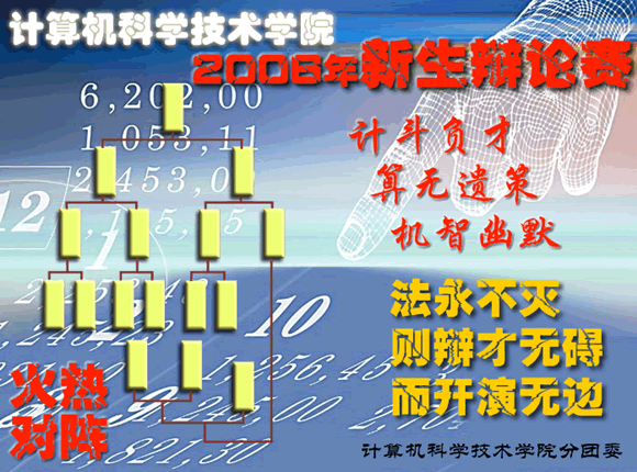 由计算机科学技术学院分团委主办的为期一个月的2006年新生辩论赛得到了学院领导的大力支持以及广大同学的积极参加。本次辩论赛事是为了丰富校园文化,弘扬校园正气,引领时代精神,展现大学生良好的精神风貌及综合素质而举办。
