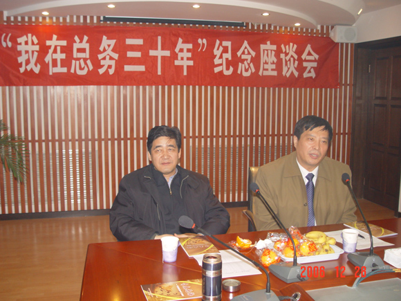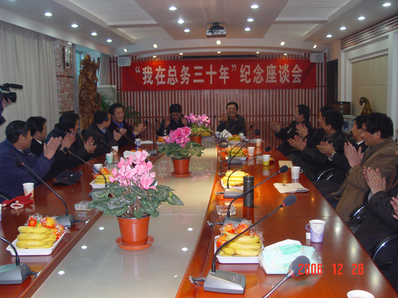 2006年12月28日下午16时许,19位在总务后勤连续工作满30年的员工们,兴高采烈、喜气洋洋的汇集到了后勤办公楼二层会议室。在这里后勤集团党委、总务后勤部为这些30多年的老员工们举办“我在总务三十年” 纪念活动座谈会。参加座谈会的有:副校长赵显利、工会常务副主席蔡本睿、后勤办主任巫后新、集团党委书记李盼兴、集团总经理杨学洲、集团党委副书记姜金凤、总务后勤部副主任丁志坤、宋希博、徐承俊,总经理助理周惠民。期间校党委副书记侯光明到会并作了热情洋溢的讲话。会议由总务后勤部副主任宋希博主持。