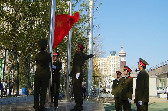 BB贝博艾弗森官方网站军事爱好者协会国旗班升旗仪仗队升国旗。