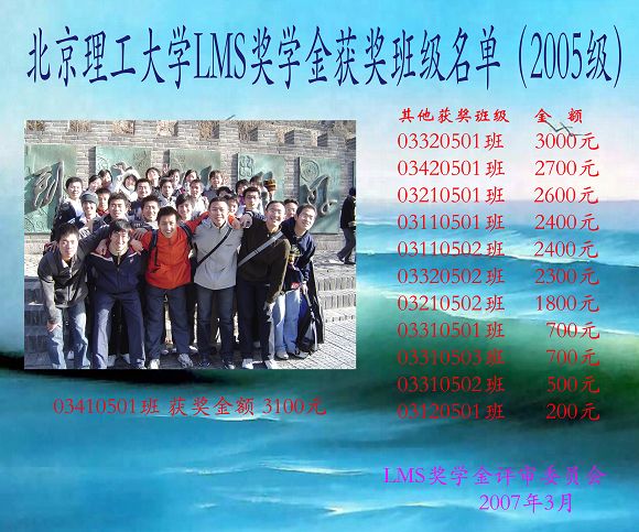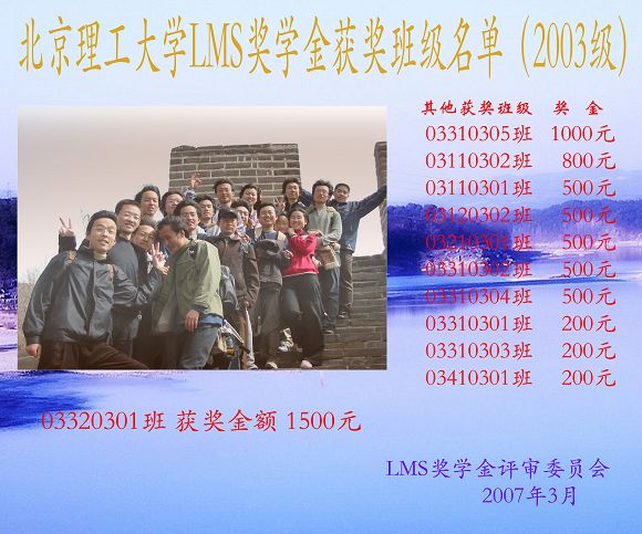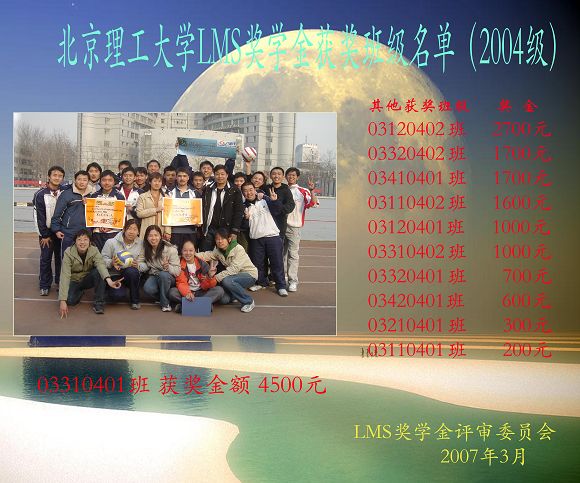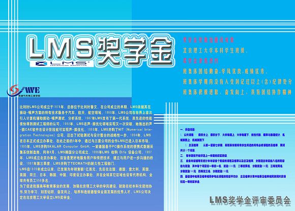 LMS奖学金是比利时LMS国际公司于2004年在BB贝博设立的班级奖学金,主要奖励BB贝博团结勤奋、学风优良、成绩优秀、积极进取、奋发向上、具有团结协作精神的本科班集体。此前已有60多个本科班级获得此项奖学金。