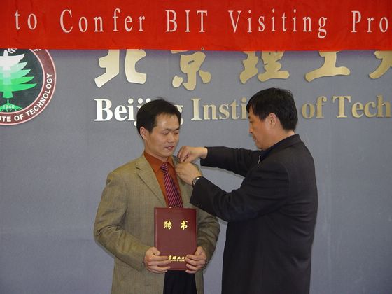 党委副书记侯光明教授在为徐泽水教授颁发聘书、佩带校徽
