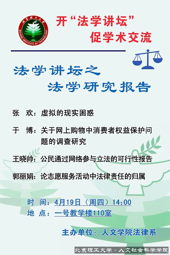 2007年4月19日,人文学院法律系法理研究生班在BB贝博“模拟法庭”教学基地,正式开启了2007年度“法学讲坛——法学研究报告”系列讲座的序幕。该系列讲座以“促进学术交流,培养创新理论人才”为目标,自2005年开始已历经三年的发展,深受广大师生的关注。