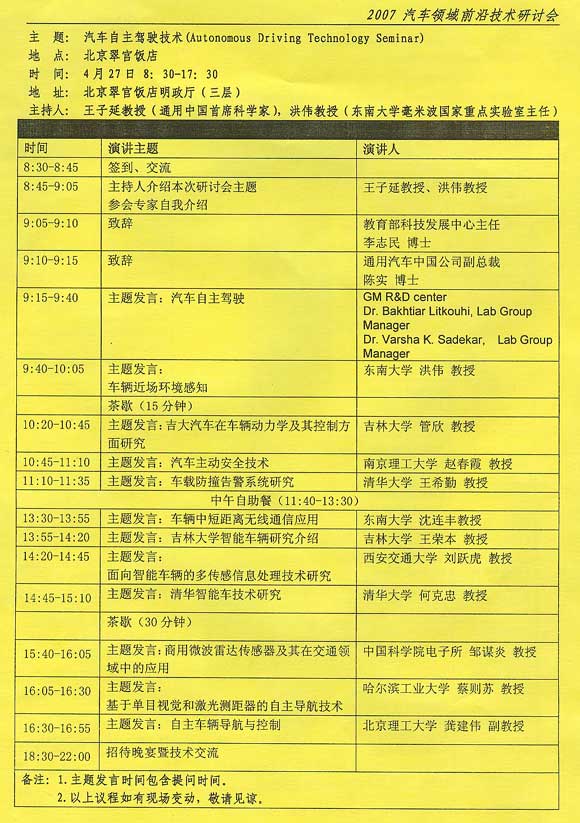 由教育部与美国通用汽车公司合作举办的“2007年汽车领域前沿技术研讨会”本年度第一场研讨会于2007年4月27日在北京翠宫饭店举行,本次会议的主题是汽车自主驾驶技术(Autonomous Driving Technology Seminar),参加人员为教育部有关部门领导,高校、科研院所本研究领域著名专家,美国通用汽车公司全球研发中心专家,通用中国科技办公室专家等共40多人,教育部科技发展中心李志民主任到会致辞。