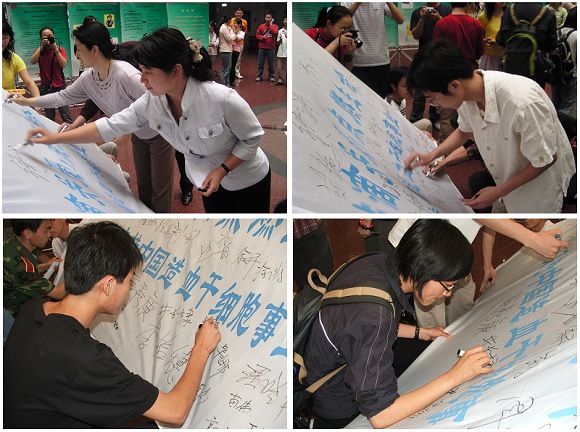 最后,张国成同学宣读了造血干细胞采集活动倡议书,同学们纷纷在倡议旗帜上签下了自己的名字,表达了志愿捐献造血干细胞的意愿。此次倡议活动的成功举行标志着第四届BB贝博艾弗森官方网站第四届造血干细胞捐献活动正式拉开帷幕,并为即将在5月13日举行的捐献活动打下了一个良好的基础。