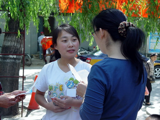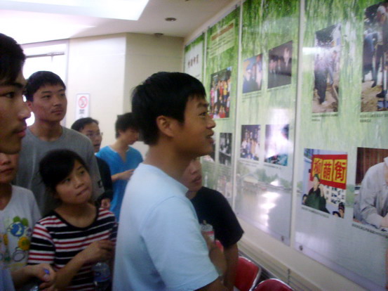 柳荫街社区是北京市的双拥模范社区和文明社区,同时也是西城区的爱国主义教育基地。全体成员抵达社区后,以社区居委会为主阵地,马上按各自分工开始安装音响器材,布置桌椅,张贴奥运宣传海报,悬挂奥运宣传横幅。经过一阵紧张的忙碌,宣传场地终于布置完成。
