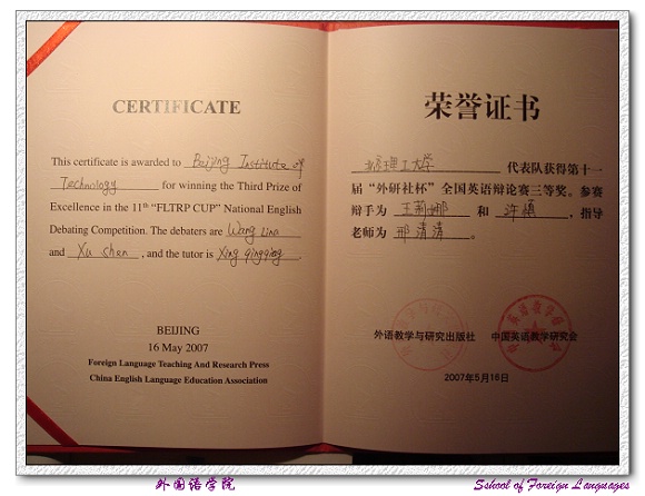 在刚刚结束的第十一届“外研社杯”全国大学生英语辩论赛中,BB贝博外国语学院英语专业09110401班的王莉娜同学和09110402班的许慎同学在八场循环赛中以五胜三负的成绩获得全国三等奖。