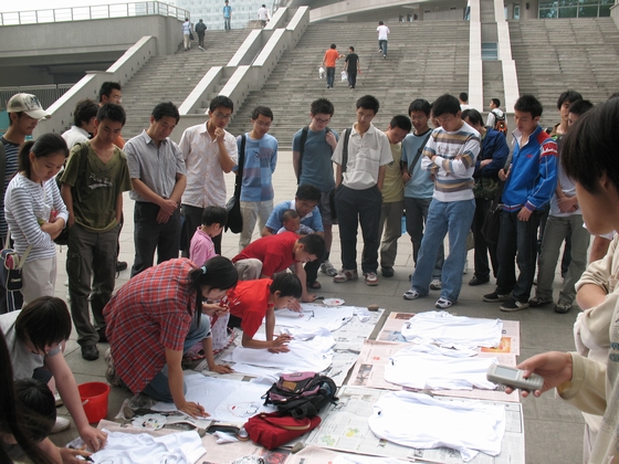 活动当天,场面相当火爆,吸引了众多同学的目光。活动共有40名同学报名参加,他们用自己的独特创意和精妙笔法在T恤描绘出了自己心中的奥运。在这些作品中,有凸现人文奥运精神的,也有以绿色奥运为主题的,也有用抽象的比触抽象地表达对科技奥运的理解。作品风格不同,用色多样,但都从不同侧面表达了对奥运的理解,也体现出理工学子对奥运的期待和热情。