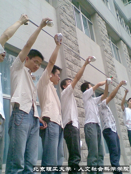 为了锻炼同学们的小团体内的领导能力、沟通能力以及合理利用资源的能力,我们进行了此项训练,每组用所给材料在有限的时间内将鸡蛋进行“包装”并自行选择挑战的高度,鸡蛋不碎则挑战成功!最后大二第一队以两层楼不碎的高度取得胜利。