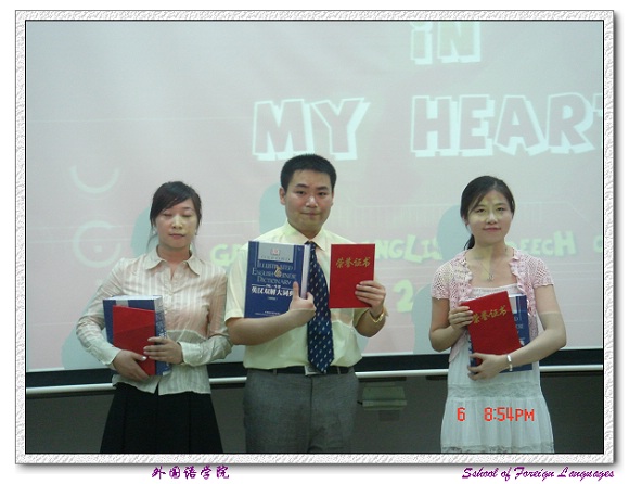 2007年6月6日晚7点,BB贝博艾弗森官方网站研究生英语演讲比赛决赛在研究生楼301隆重举行。本次研究生英语演讲比赛由BB贝博艾弗森官方网站研究生院和外国语学院共同主办,旨在进一步活跃研究生英语学习的氛围,进一步提高研究生的英语水平。研究生院副院长王渝应邀出席了本次比赛。评委由外国语学院研究生英语教研室教师组成。提问教师为美籍教师杨真真和法籍教师Galio。
